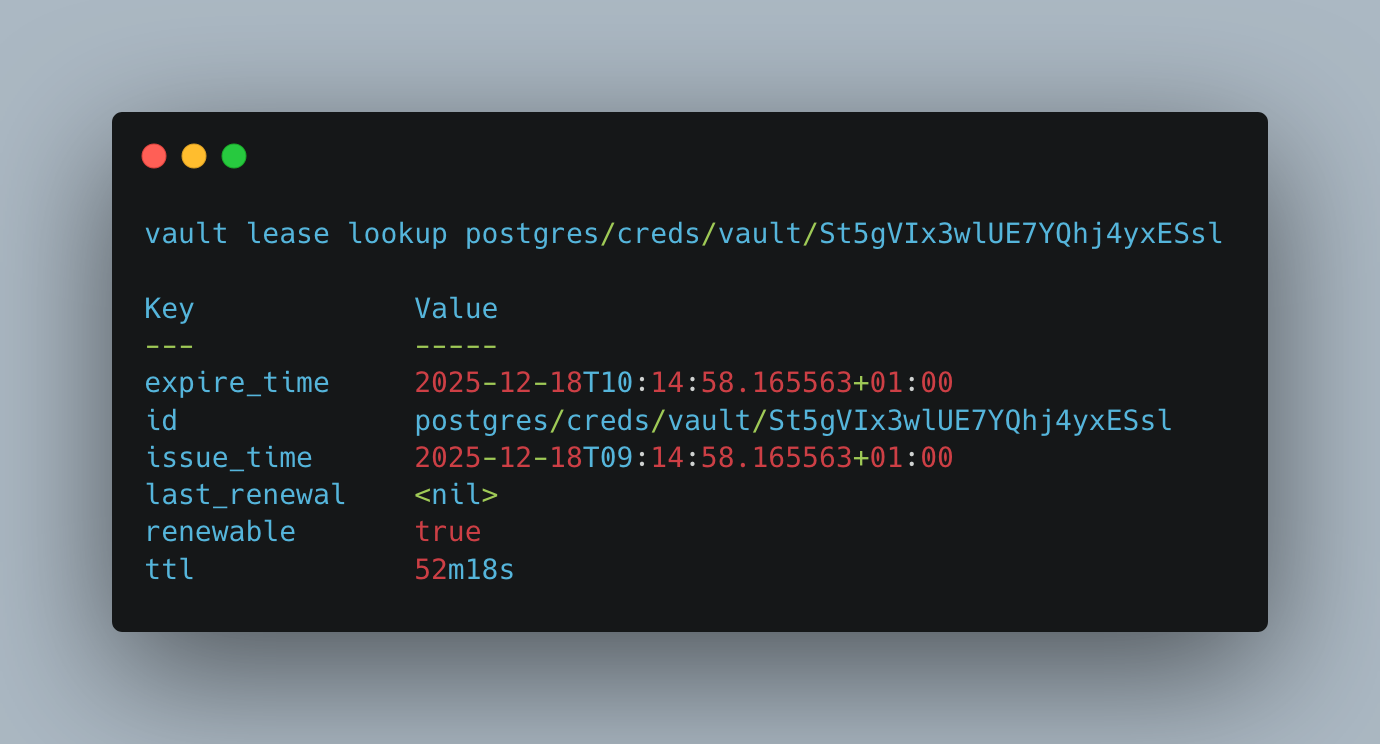 2025-12-18T09:40:07.289+0100 [INFO] expiration: revoked lease: lease_id=postgres/creds/vault/St5gVIx3wlUE7YQhj4yxESsl