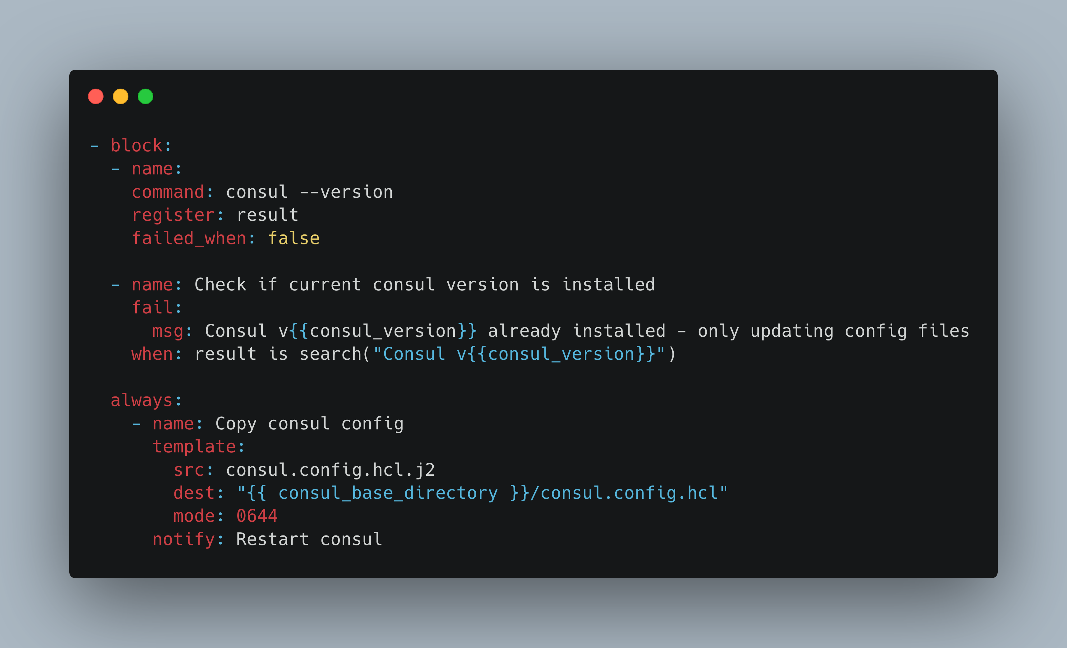 Finally, you can explicitly fail when a condition is not met. Here is an example from my infrastructure at home project: I'm checking if the Consul program in a certain version is already installed, or stop the play immediately.