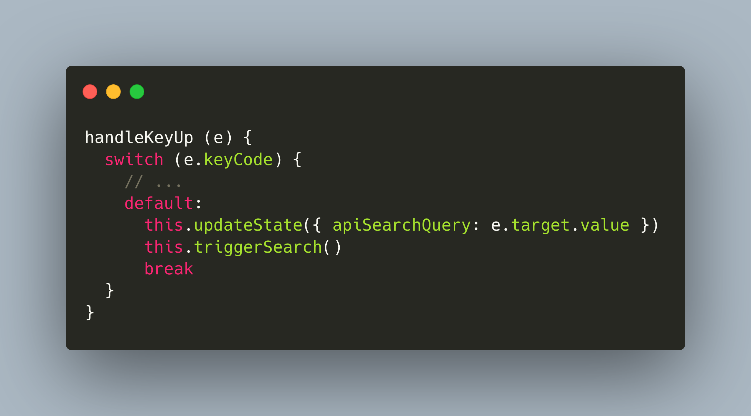 When the event is triggered, the custom method handleKeyUp() will be called. This method uses a switch-case statement to process the event. It detects which key was pressed, and handles it accordingly. The default case is to update its state and trigger the search. See below.