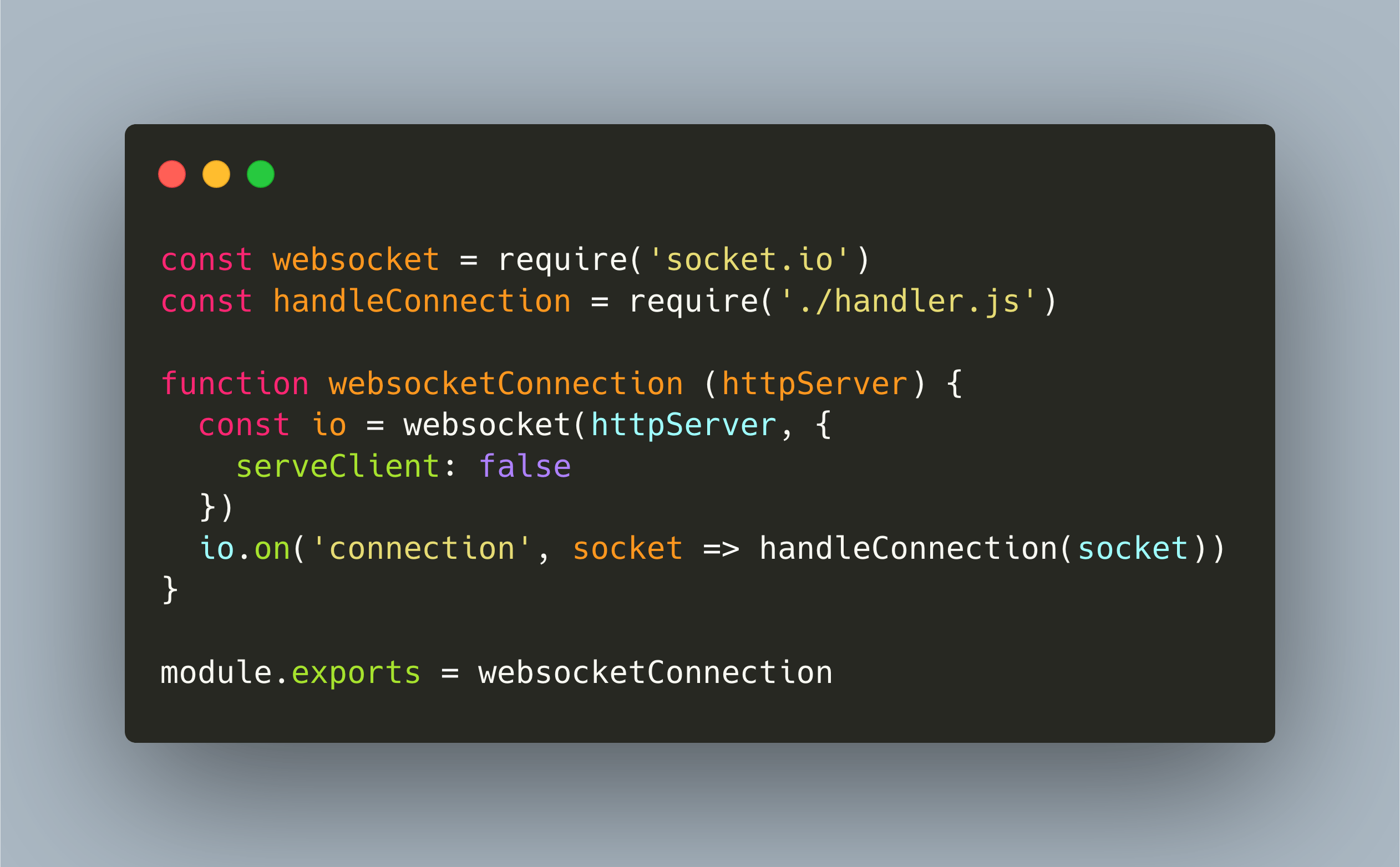 The connector defines how the websocket is configured. We create an instance called io (line 6), which receives the express server instance and an optional configuration object. Options are manifold, see the official documentation. Then, for the websocket instance, we define an event listener for the connection event (line 9). When this event happens, the handler will take control.