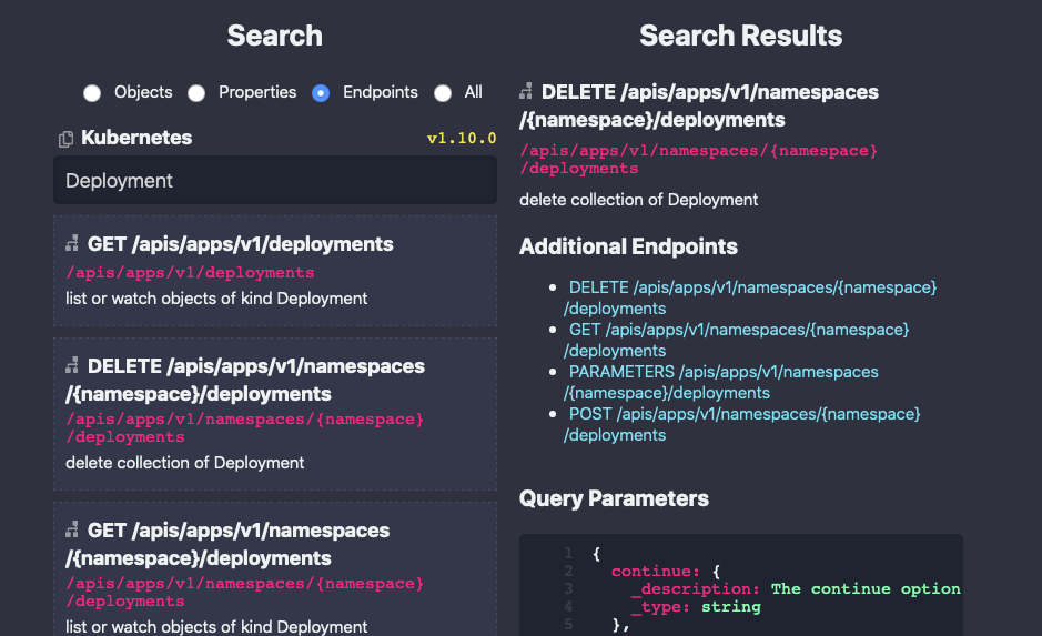When searching for API elements, you will find objects, properties and endpoints. When selecting them, they will be displayed differently: objects show their data model, properties a list of ranked objects in which they appear, and endpoints show request parameters as well as complex response objects.