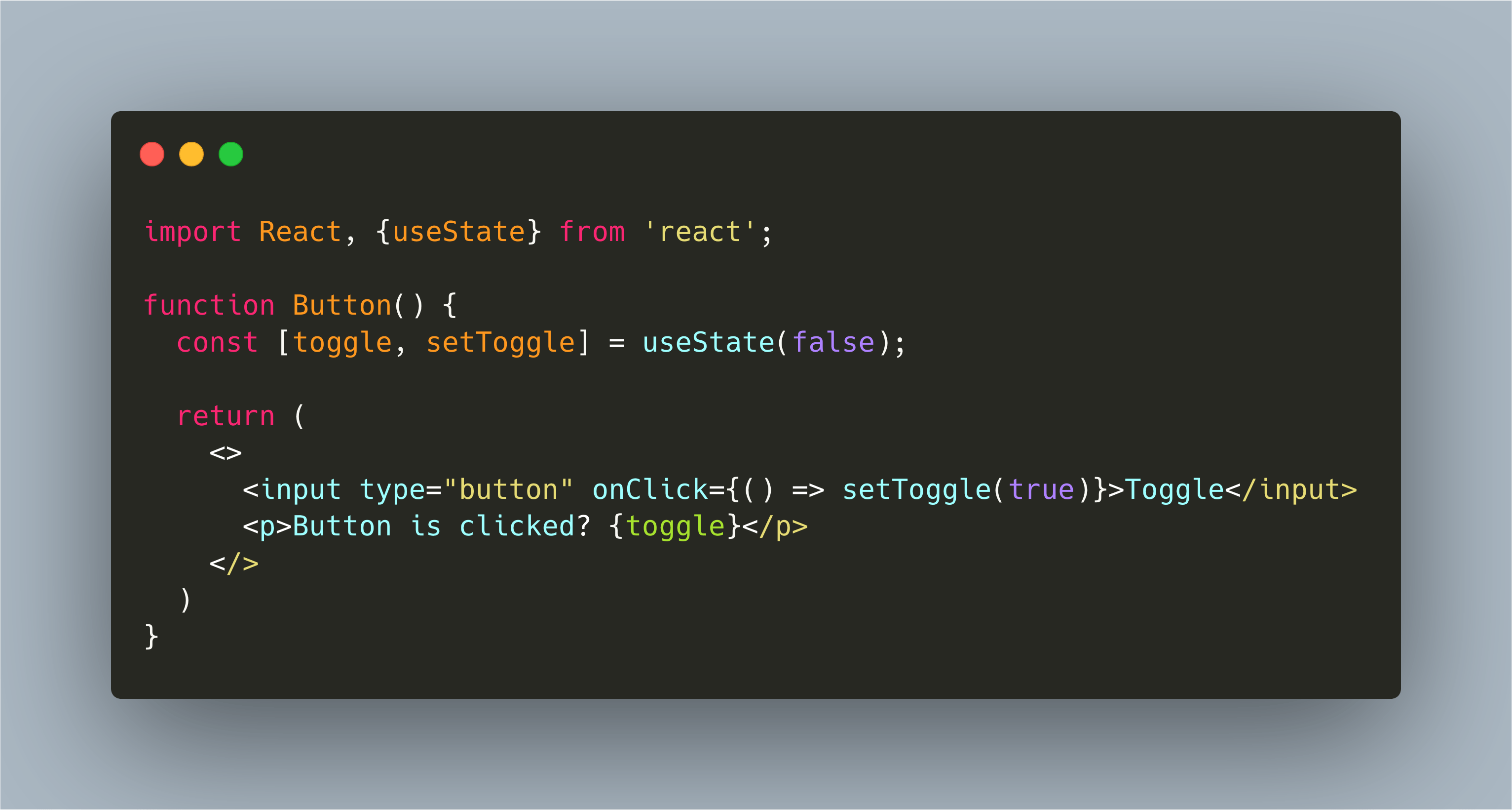 The useState hook is the most widely used Hook.With it you add local state to a functional component. Consider a button that has a toggle state. Here is the code: