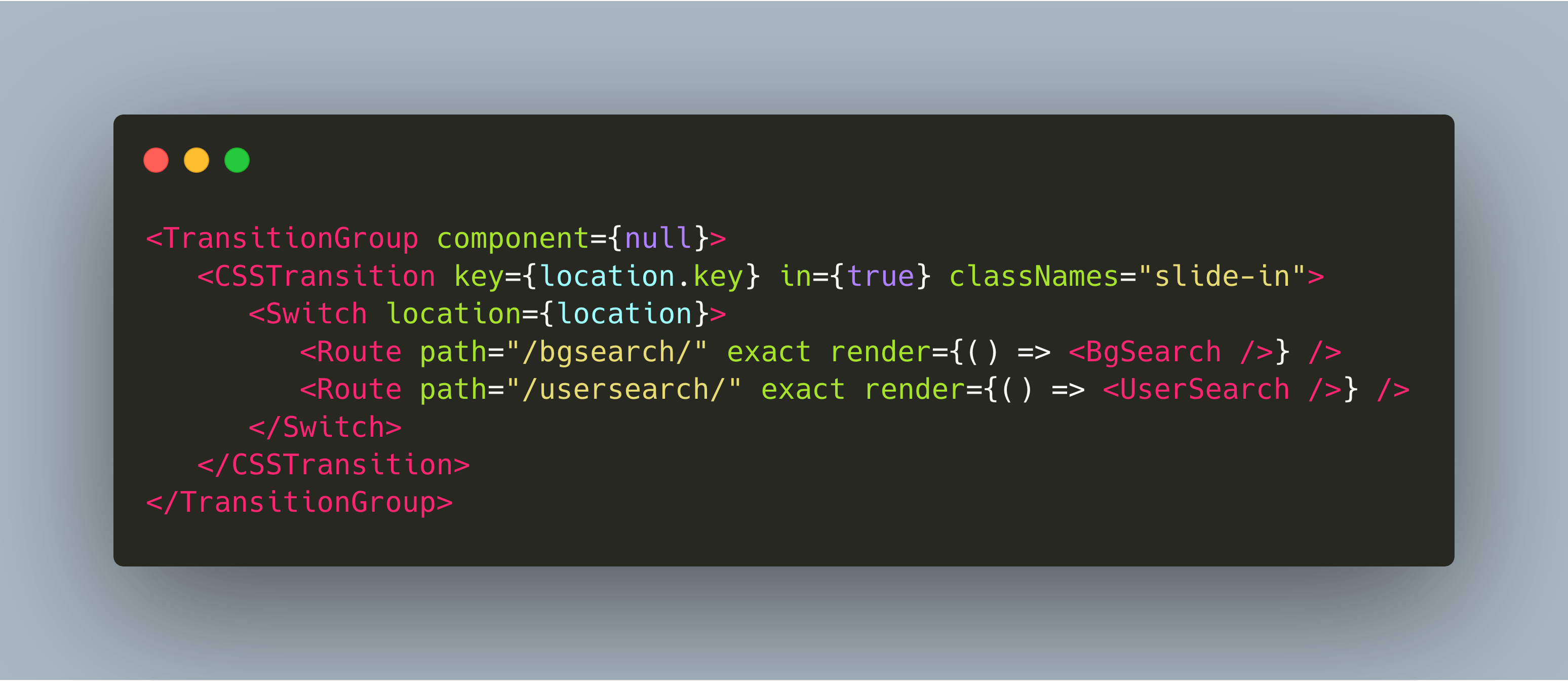 The final piece to make the app smoother is to add CSS transitions when loading a new page. The basic idea is the same: You use <CSSTransition> to wrap elements. For page transitions, the element that are wrapped are the react router route definitions.