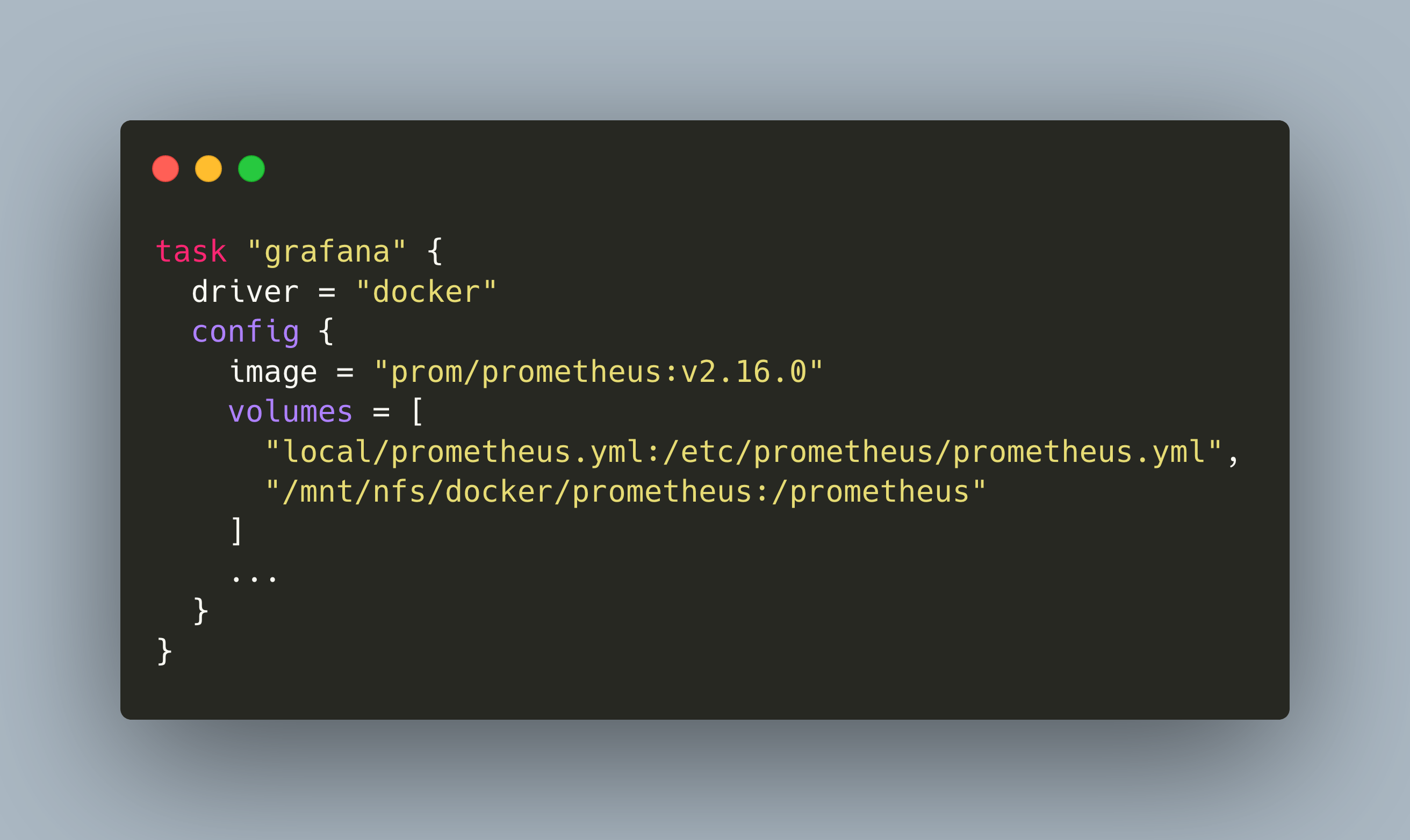 No volume declaration needed. No docker volume creation on the host. Just one line per volume in your Nomad job!