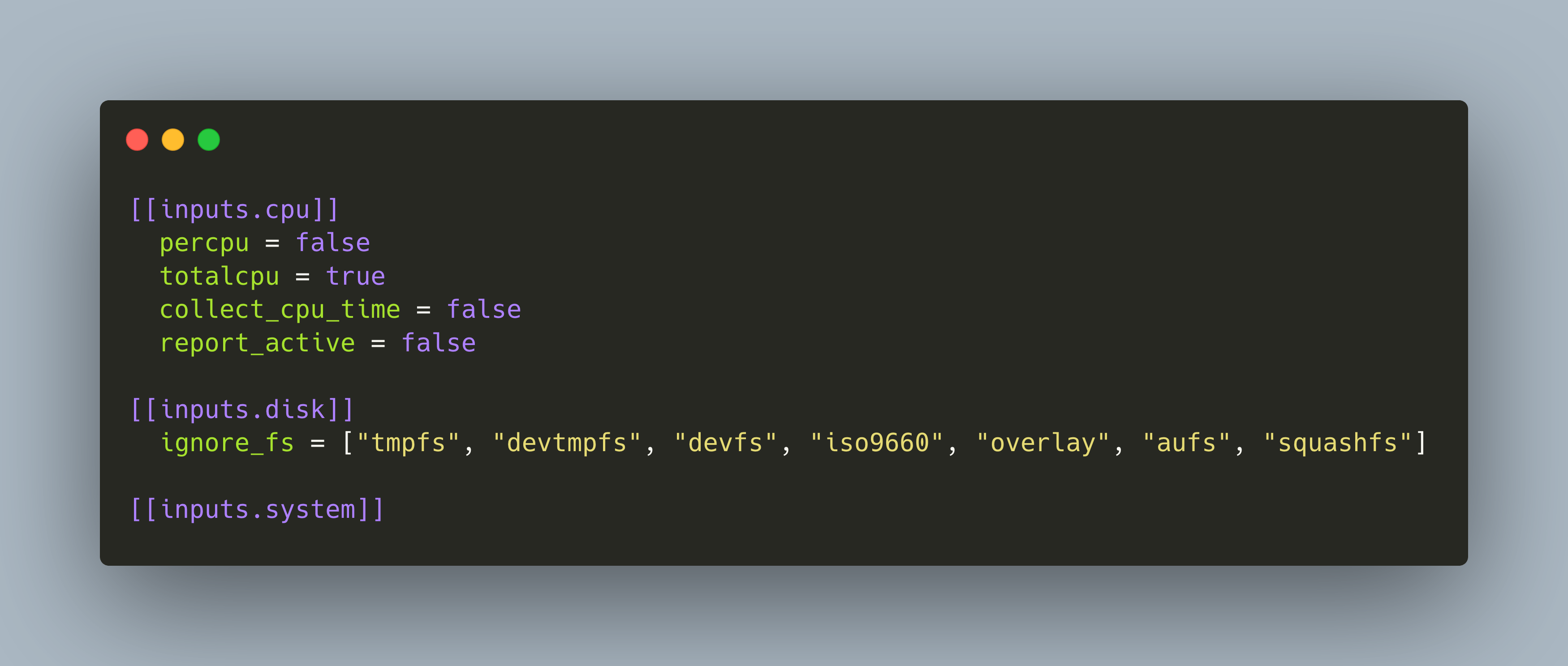 And also, we need to add the metrics that we are interested in. In Telegraf’s language, these are inputs - see the complete input list for all available options. As an example, lets scrape system, disk and CPU stats. Add the following to the ``