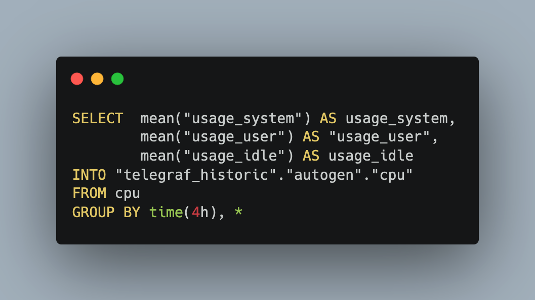 cq_cpu CREATE CONTINUOUS QUERY cq_cpu ON telegraf RESAMPLE EVERY 1d BEGIN SELECT mean(usage_system) AS usage_system, mean(usage_user) AS usage_user, mean(usage_idle) AS usage_idle INTO telegraf_historic.autogen.cpu FROM telegraf.autogen.cpu GROUP BY time(1h), * END