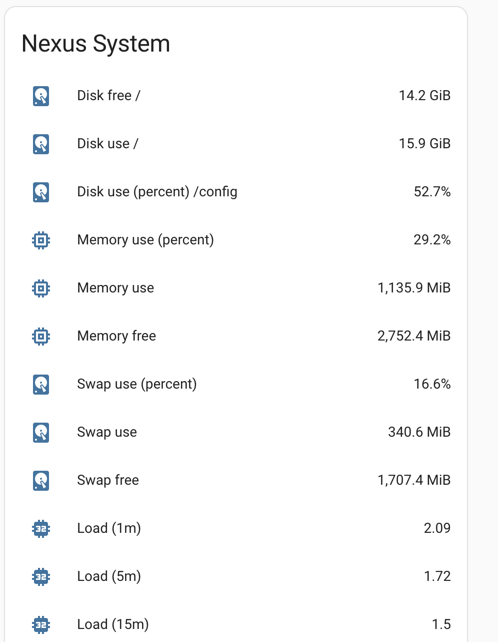 Out of curiosity, I used this handy plugin for collecting data from the host system. To active it, add a new sensor systemmonitor to your configuration.yaml file: