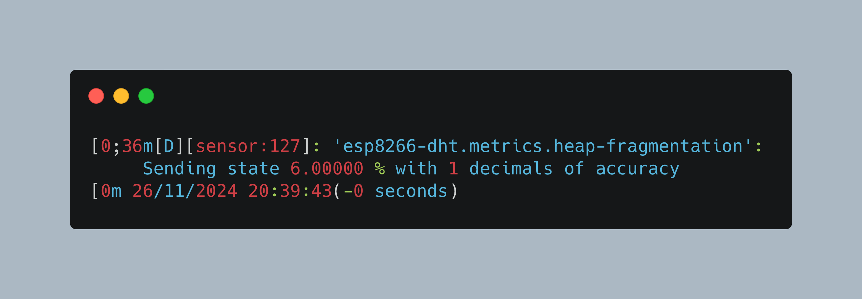 [0;36m[D][sensor:127]: 'esp8266-dht.metrics.heap-fragmentation': Sending state 6.00000 % with 1 decimals of accuracy[0m