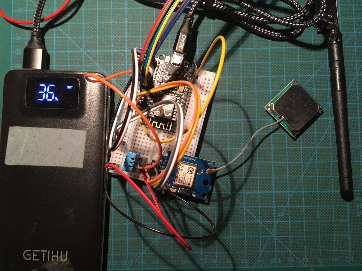 Then, for the final assembly, I flashed the ESP board with a program without deep sleep instructions, waiting for the GPS signal fix. Once its available, I immediately flashed the sensor again with the original program, assembled all components in a box, and took the sensor operational.