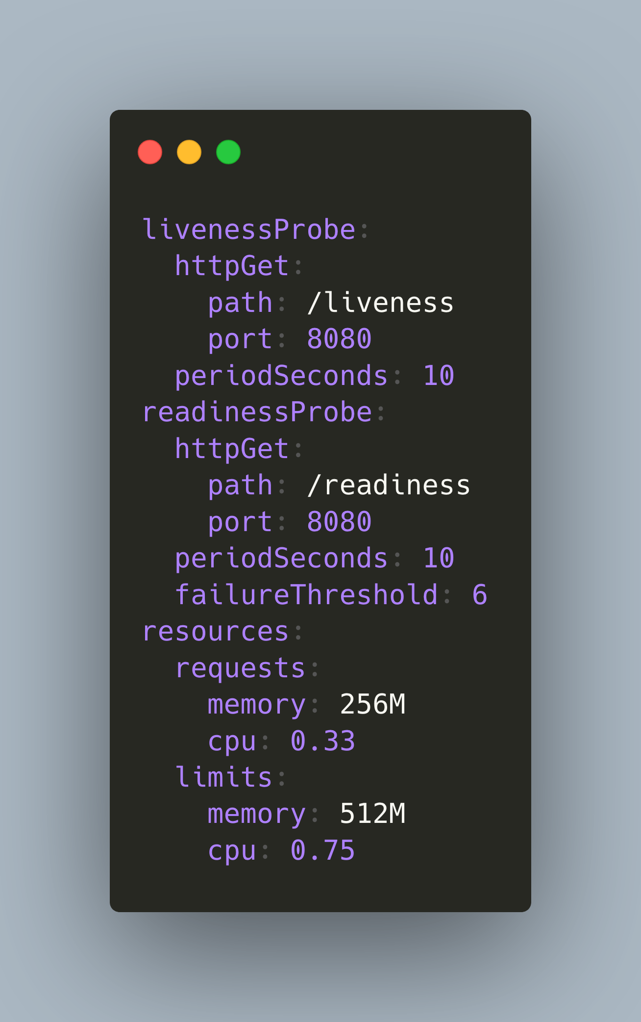 - Liveness: This check is about the pod being operational, meaning it provides the functionality and endpoints that are required. It specifically also means that the pod is not in a state of deadlock. If the liveness check fails, the pod will be terminated and replaced by a new one.