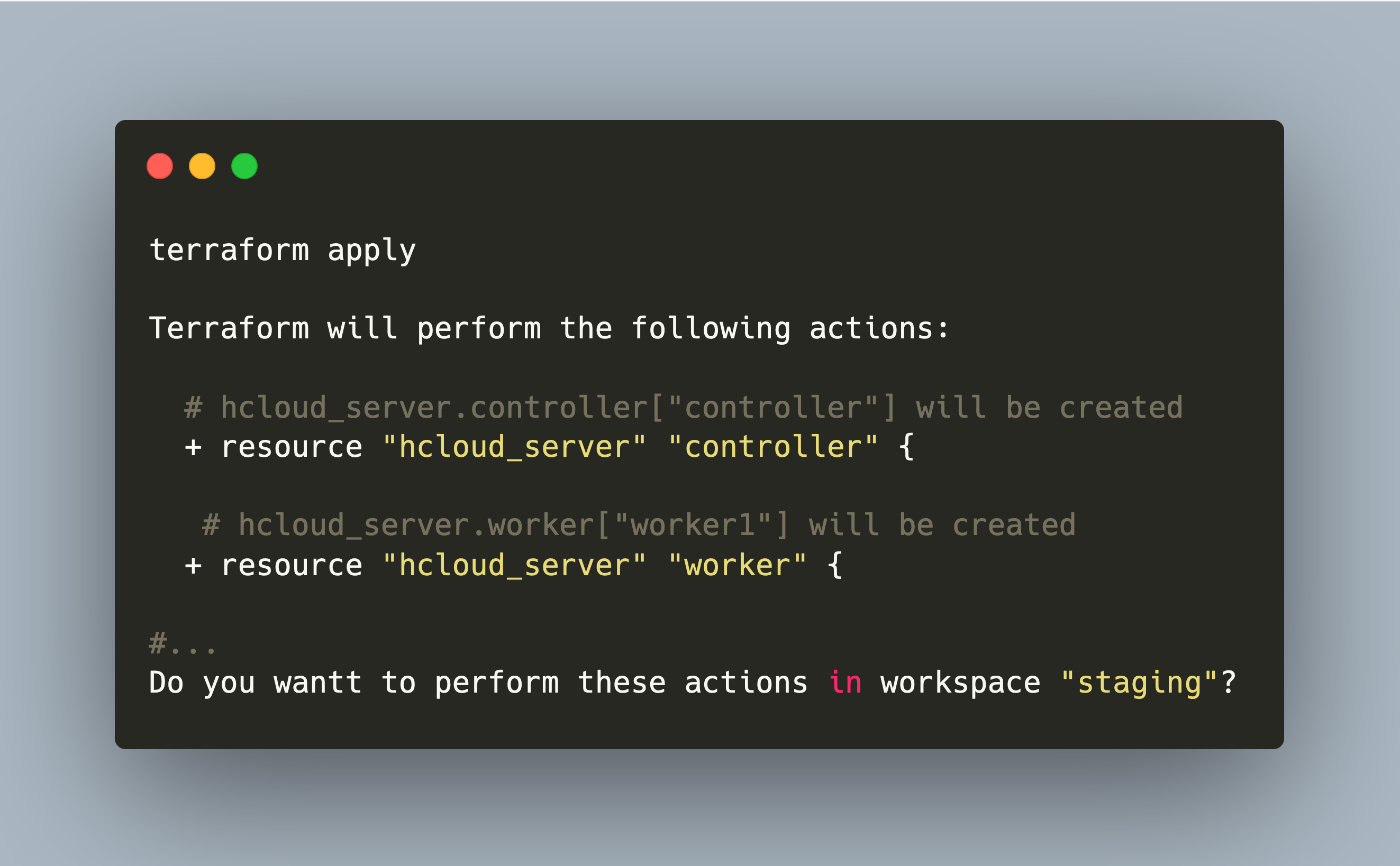 # hcloud_server.worker["worker1"] will be created
