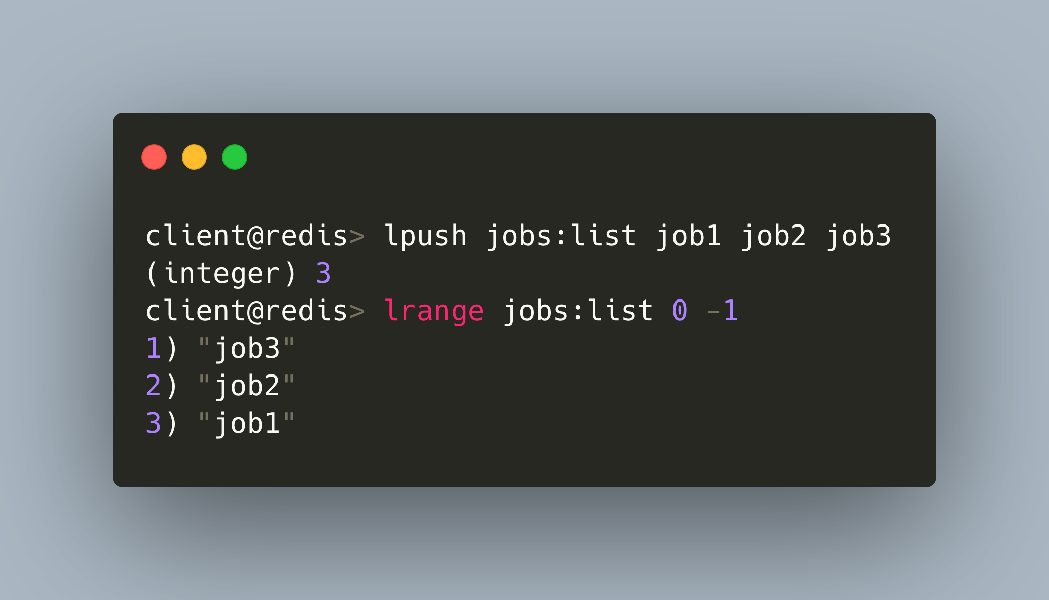 Let’s see an example working with a list. We create the list jobs:list and push the values job1, job2, job3 into it. Then with lrange we print the list content, starting at the index 0 until its end. We extract a value with lpop and print the list content again.
