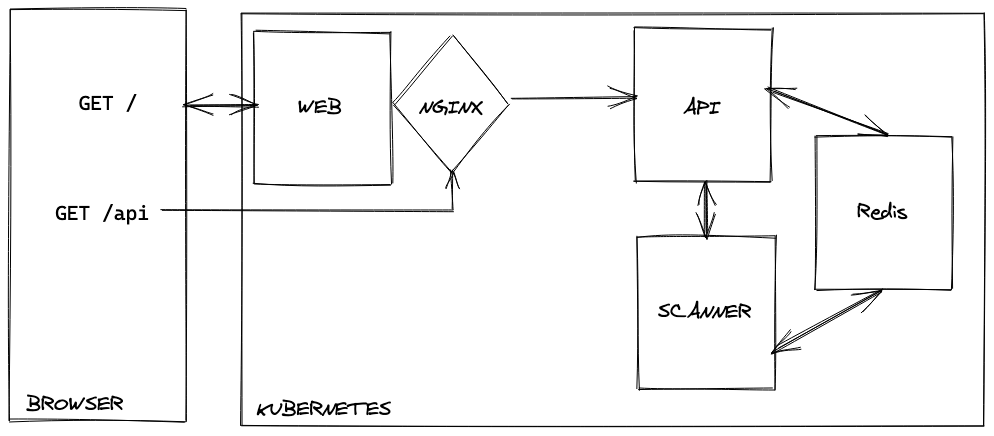 The API has two primary routes. At /jobs, the status of any job can be requested. And at /scan, new scan requests can be scheduled. The API part is written with the HAPI framework, and it is stateless because all data is stored in Redis.