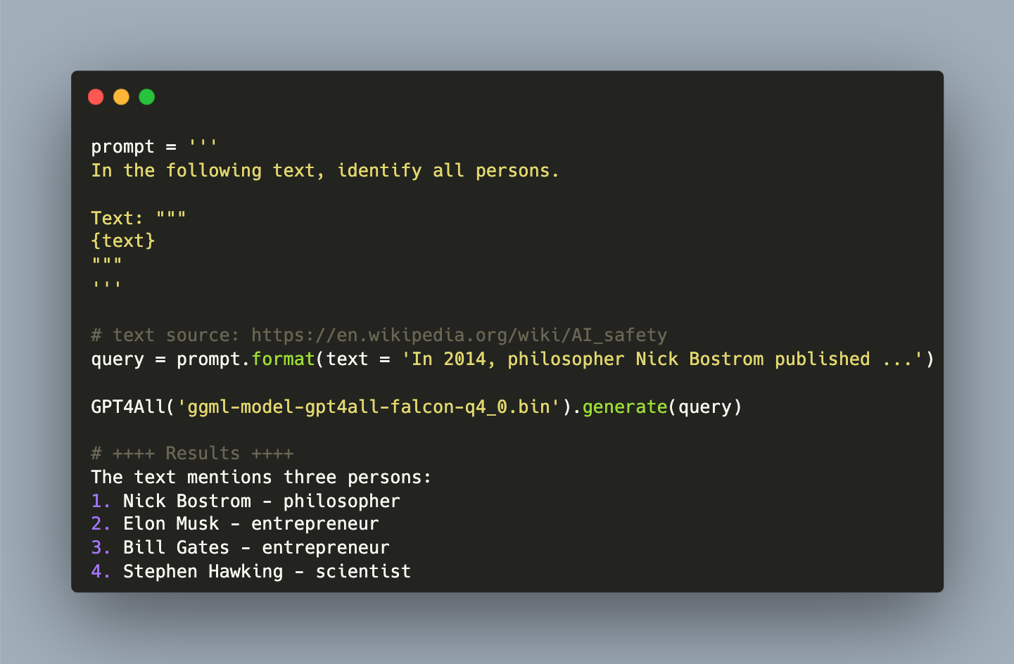 Loading and using different LLM models with gpt4all is as simple as changing the model name that you want to use. This makes it ideal to compare how different models complete several NLP tasks.