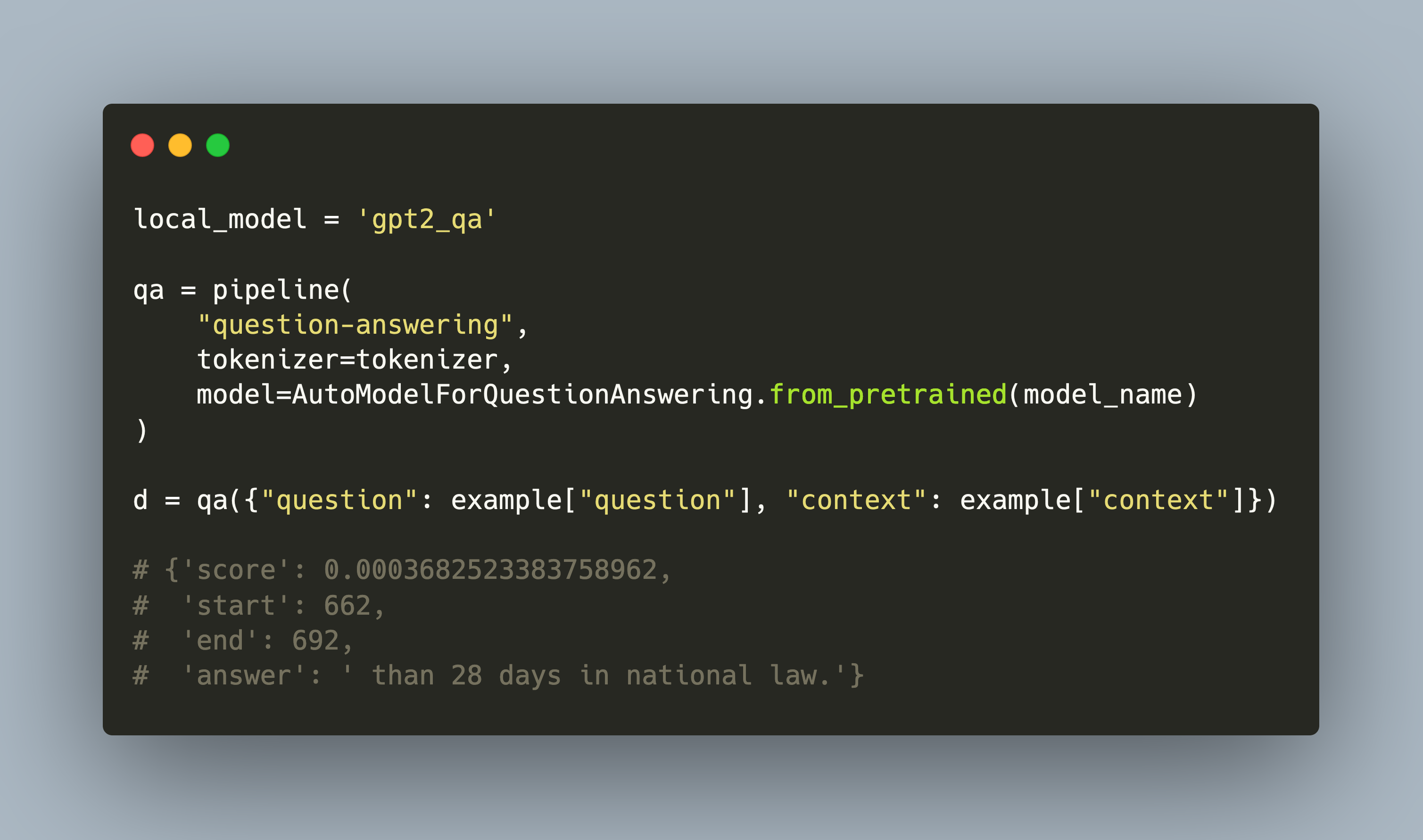 To use the model, we create a question-answering pipeline, specify the tokenizer and local model. And then we transform an example dataset into a dictionary object with question and context keys.