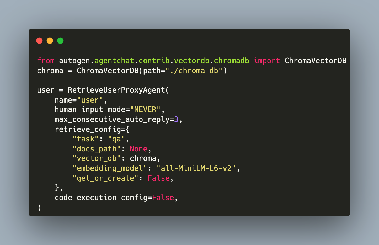 However, as explained in the introduction, Autogen also provides specific agent types that can automatically access a configured vector-database to fetch relevant content and populate their internal prompt - check the Autogen blog article Retrieval-Augmented Generation (RAG) Applications with AutoGen to see and introduction.