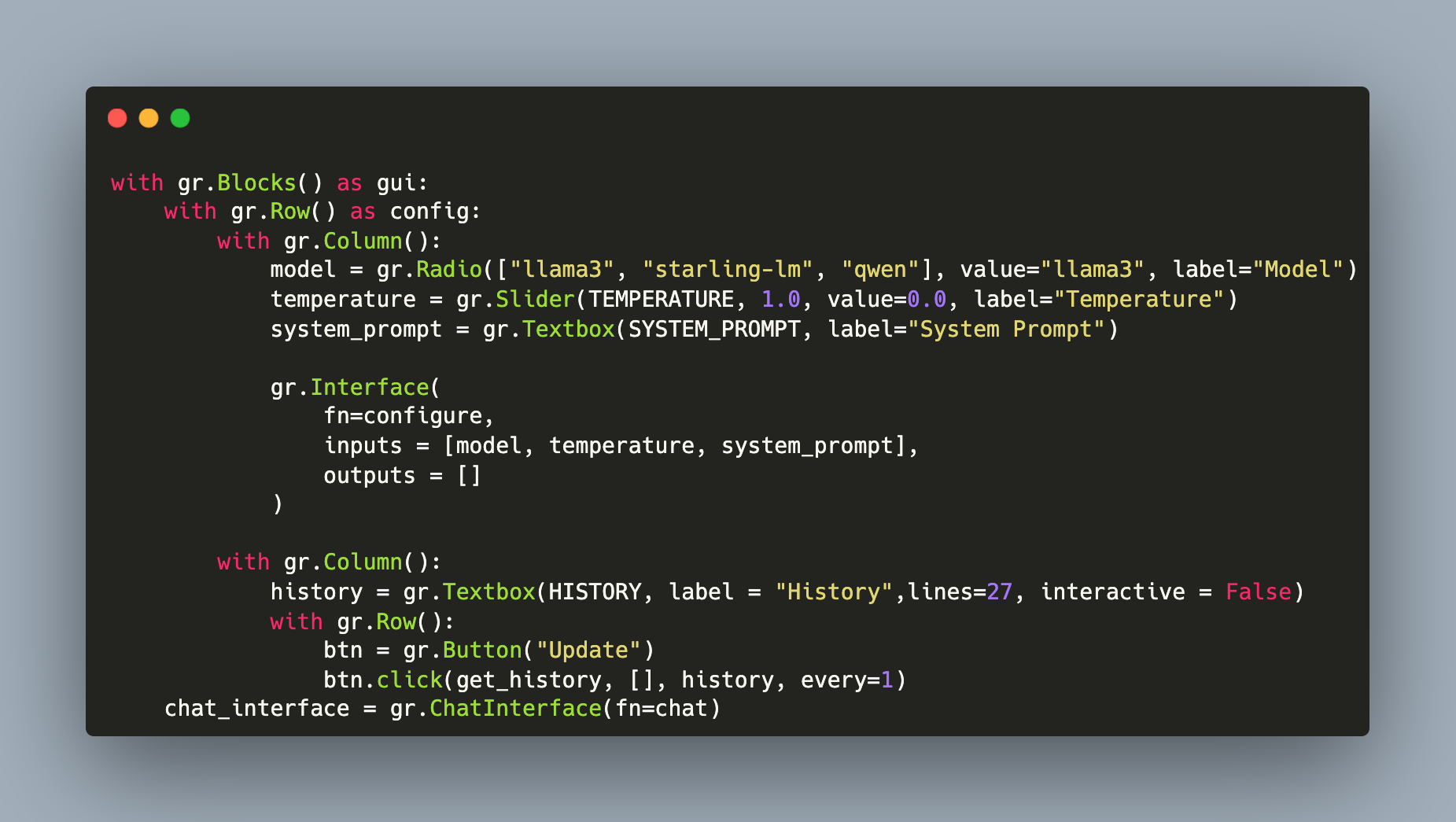 This article explored how to design a custom GUI for running LLMs. Three specific feature sets were presented and implemented. First, the configuration of the model, system prompt and temperature. Second, showing the complete chat history in its native list format. Third, starting and visualizing a continuous chat. You learned how to structure the GUI with the Gradio framework, leveraging its high-level components to create blocks of connected components. You saw how component values are exposed as state inside the block, and how to define global objects that persist the chat history as well as the loaded LLM models.