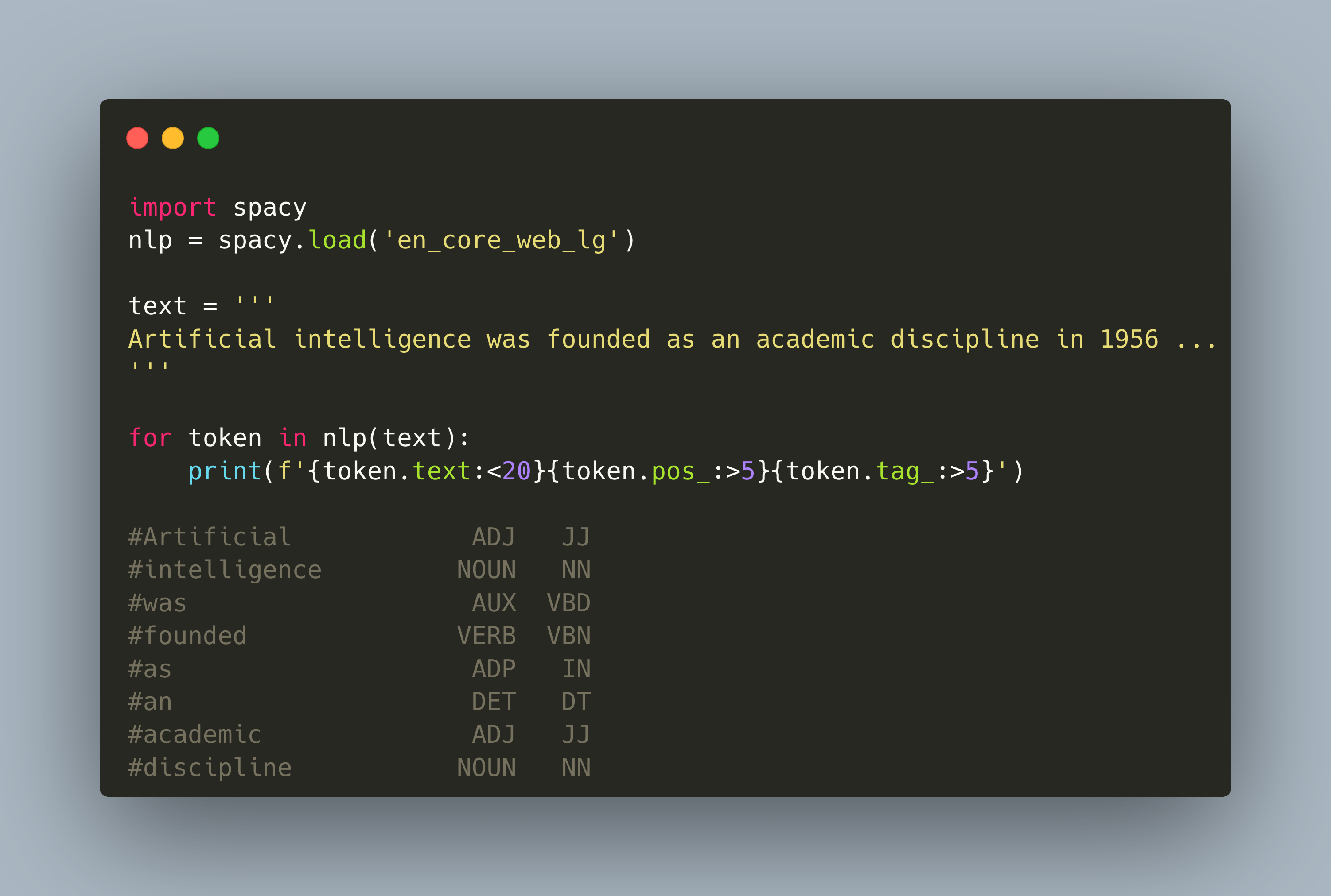 - Parts of Speech tagging: Apply the pars tree and tag the tokens in a sentence as nouns, verbs, adjective, punctuation etc.