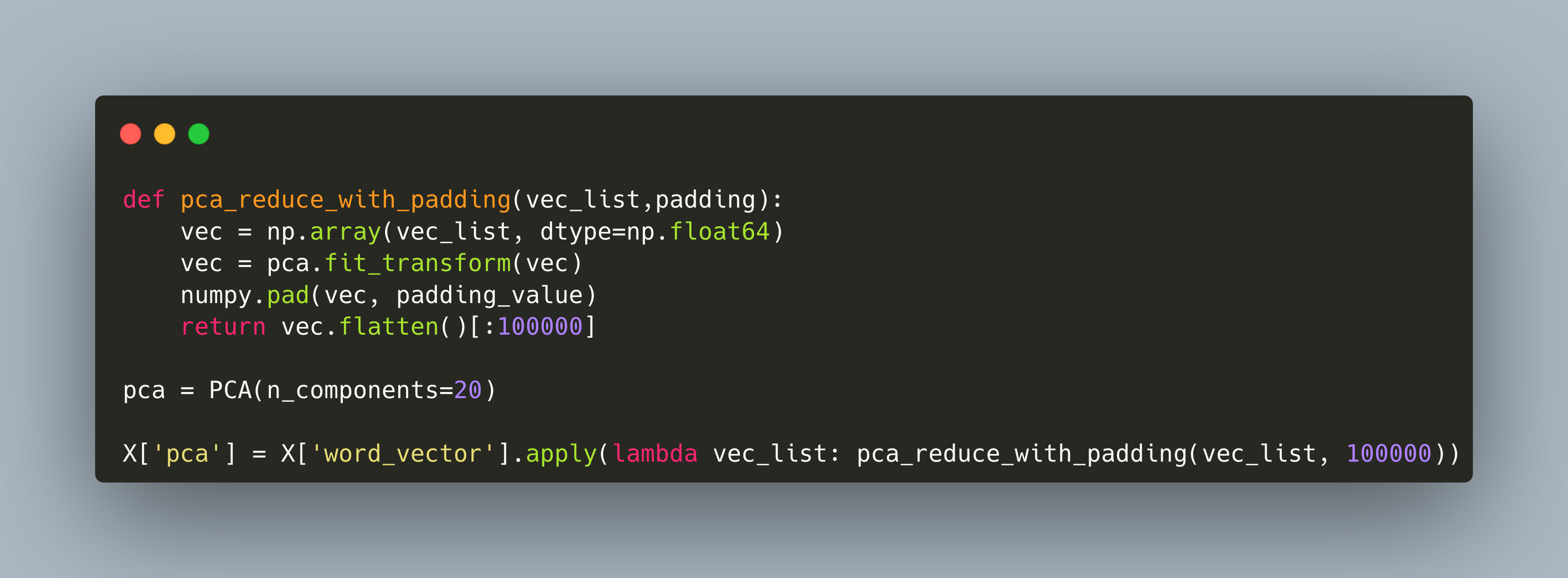 X['pca'] = X['word_vector'].apply(lambda vec_list: pca_reduce_with_padding(vec_list, 100000))