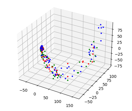 The 2D graph shows a clearer separation between the data points, and in 3D, we see some differences between the red and green marked points.