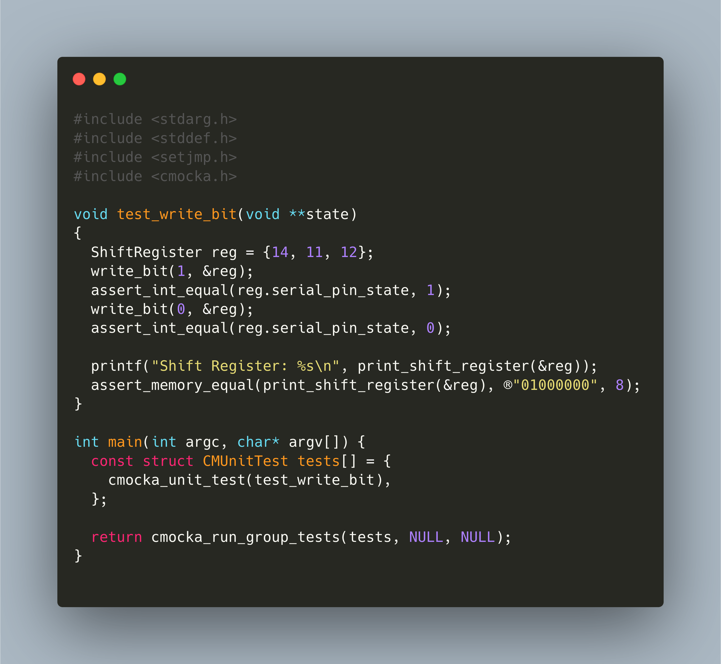 The first test is about initializing a shift register and see that it's defined pined are correctly defined inside the struct. We will use the familiar assert_int_equal test.