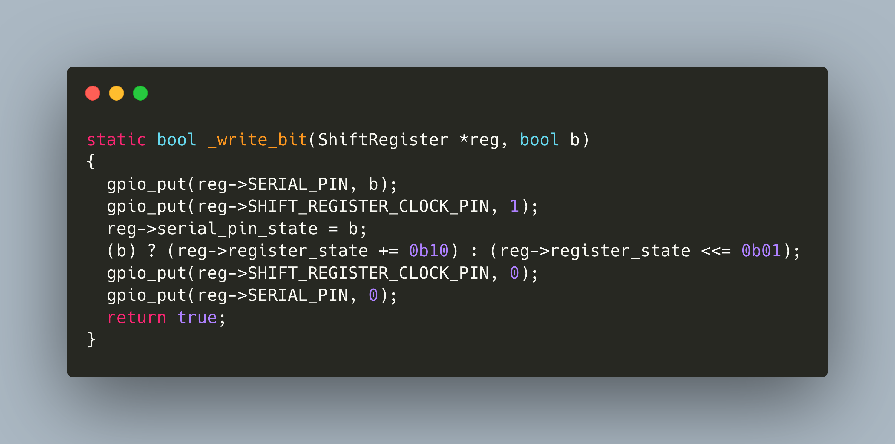 With this shift register created, we should now write a single bit. Since C has no objects, you typically define functions that receives a pointer to objects, and the arguments.