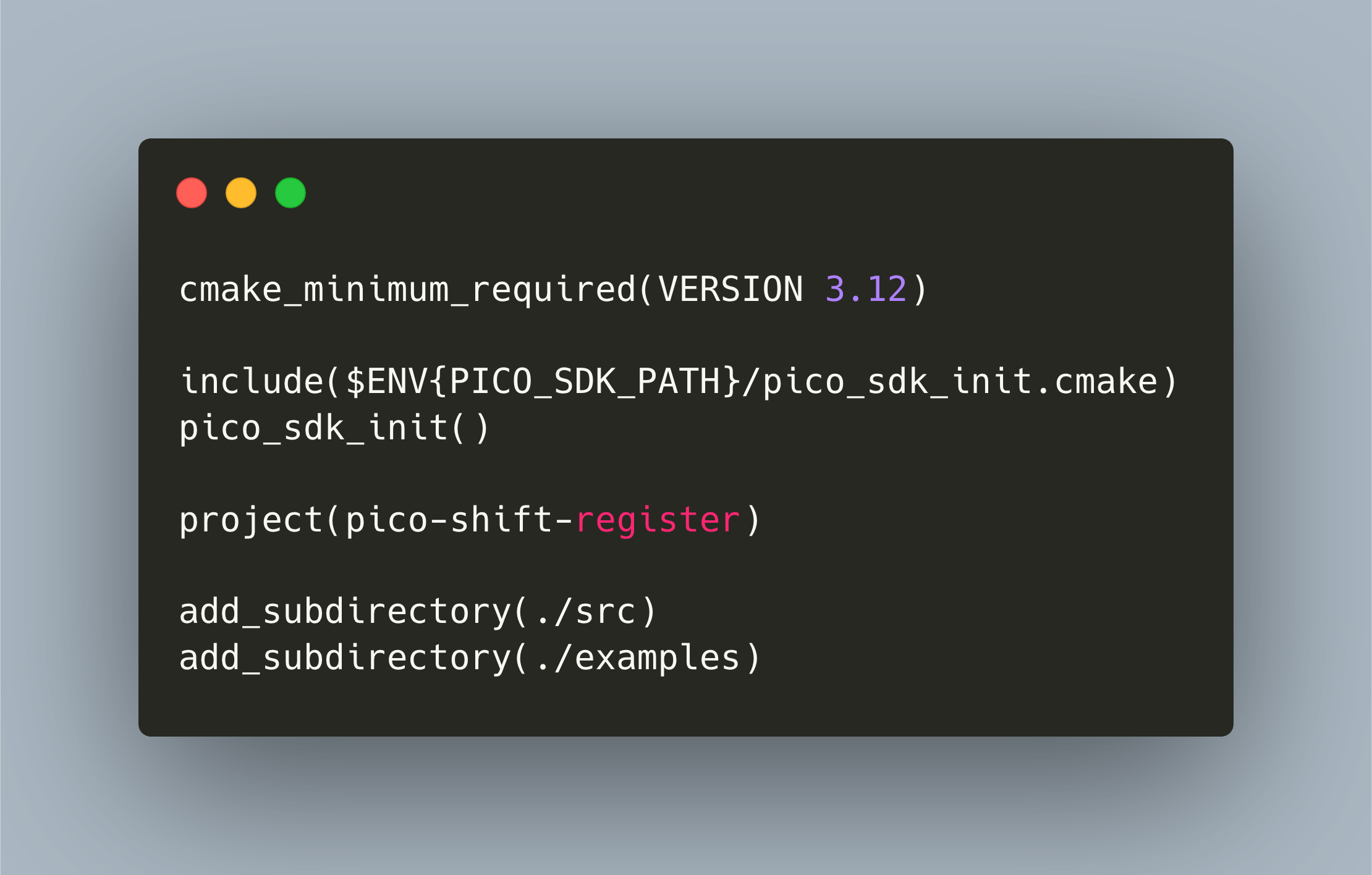 Specific for the Raspberry Pico is the include statement to load the Pico SDK, and the custom CMake function pico_sdk_init. It is imperative that you place this at the top of the root config!