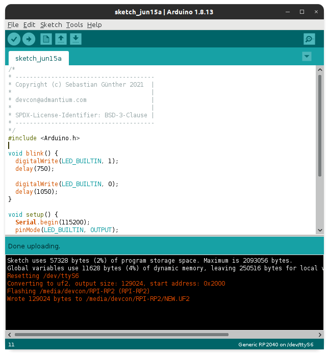To get started, you apply similar steps as with MicroPython: Download the UF2 file from the official CurcuitPython project page, connected the Pico in mass storage mode and drop the UF2 file.
