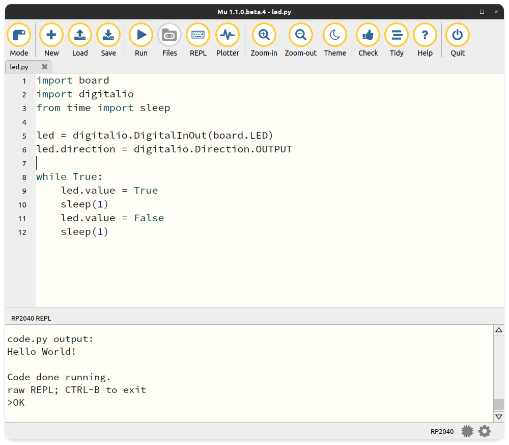 The official IDE is Mu. Its layout is similar to the Thonny IDE: A code editor on the top, and a terminal at the bottom that runs the interactive python console once the Pico is connected. File handling and interactive development work similar. Mu has additional features: An interactive debugger with an inspector module to peak into variables etc. at runtime, and a plotter, a graphical tools that translates printed numbers to graphs.