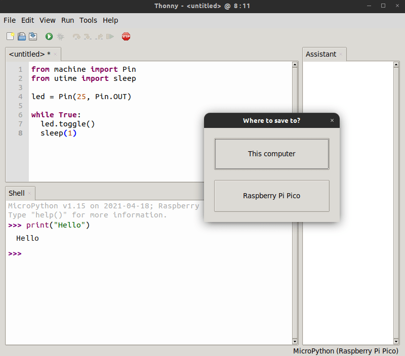 The officially recommended IDE for MicroPython is Thonny. Thonny is deliberately simple. In the text editor area, you can write Python code, then store it on your computer or directly on the Raspberry Pico. Storing on the Pico means: Either in the root or lib folder on the Pico, you can save any scripts, allowing you more complex projects with different files. And if you save a script called main.py directly in the root directory, this will be executed as your Pico’s program. Alternatively, you can open a serial connection to the Pico and implement a program interactively.