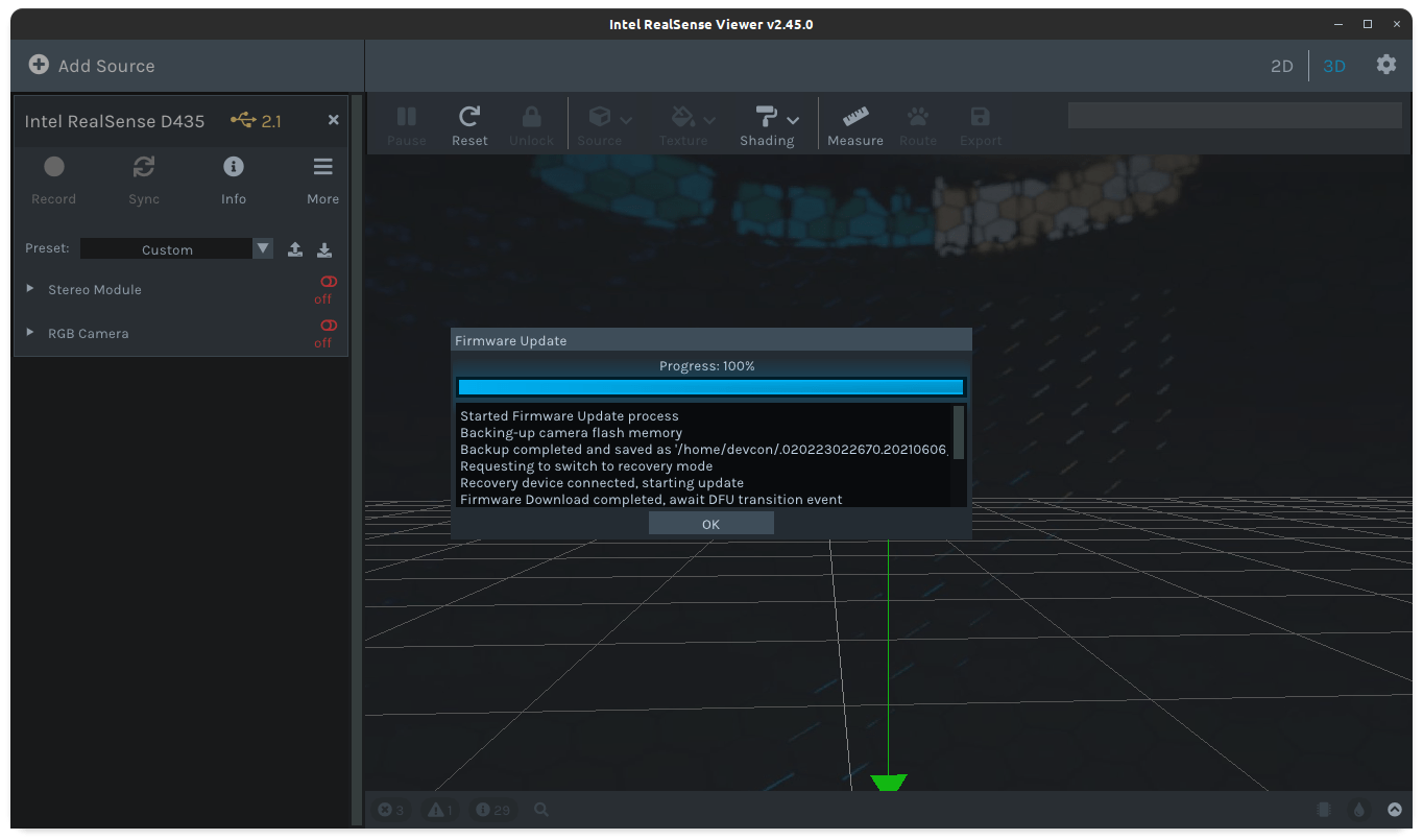 [ 245.178354] uvcvideo: Found UVC 1.50 device Intel(R) RealSense(TM) Depth Camera 435 (8086:0b07)