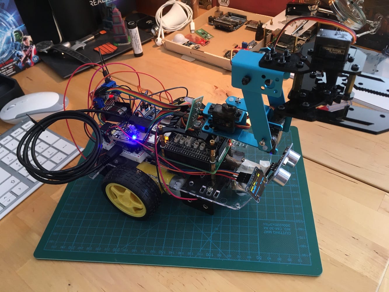 Following the exploration phase I started to build the robot. Once I got all the components, I began to build RADU M1 from scratch. The chassis with 4 wheels, a motor controller, and the Arduino. The Arduino provided a simple command-line interface - see this blog post about a generic serial terminal - that activated the motors. With this foundation, the other sensors were added: Distance sensor, a LED Matrix, and an IR receiver. This phase concluded with a moveable, IR controlled robot I was very happy. Furthermore, working with Microcontrollers in general was very interesting and I wrote 17 blog articles to cover various topics.
