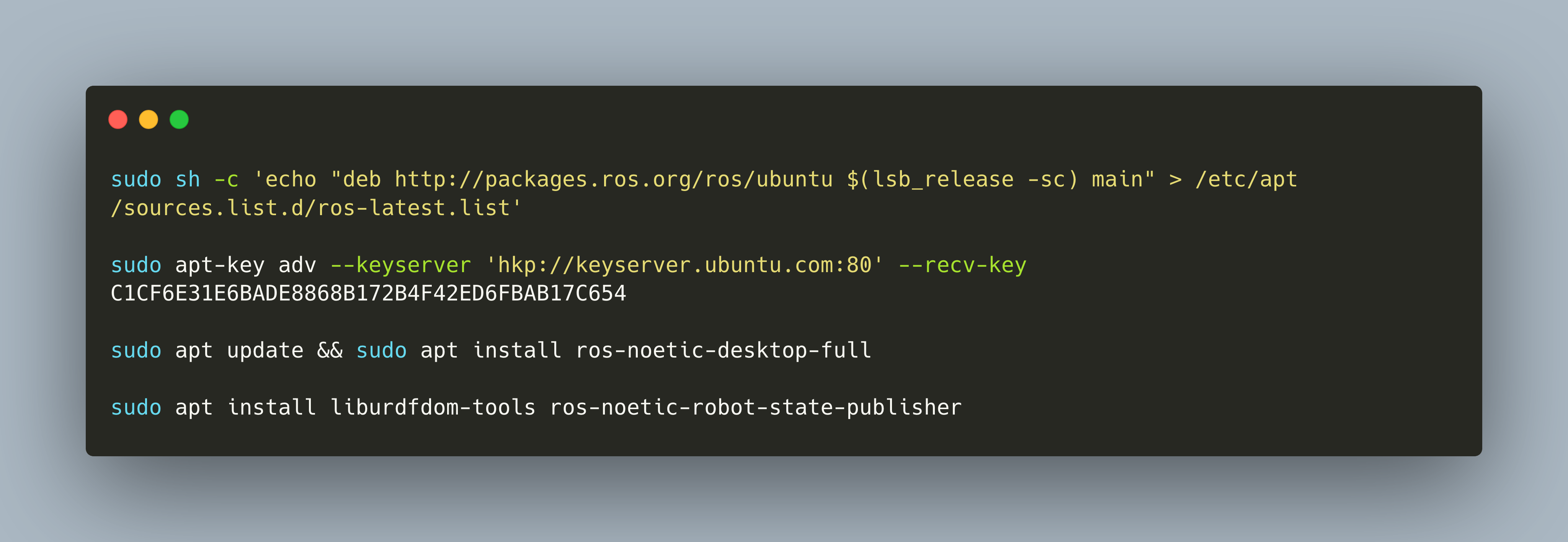 sudo apt install liburdfdom-tools ros-noetic-robot-state-publisher