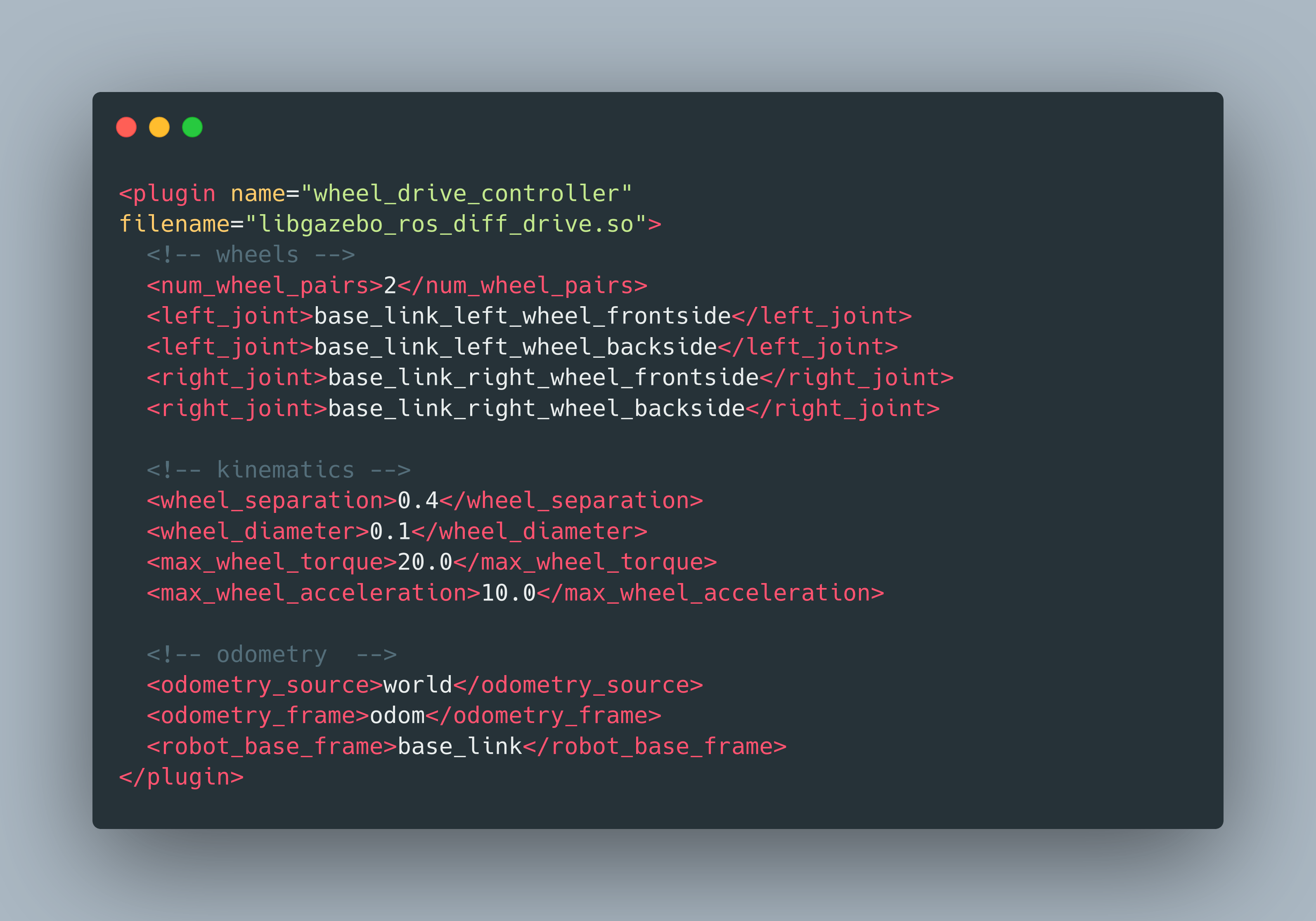 To use the plugin in addition to your robots’ physical model is much less complex then adding the controller nodes manually. In fact, you just need to add a single <plugin> tag!