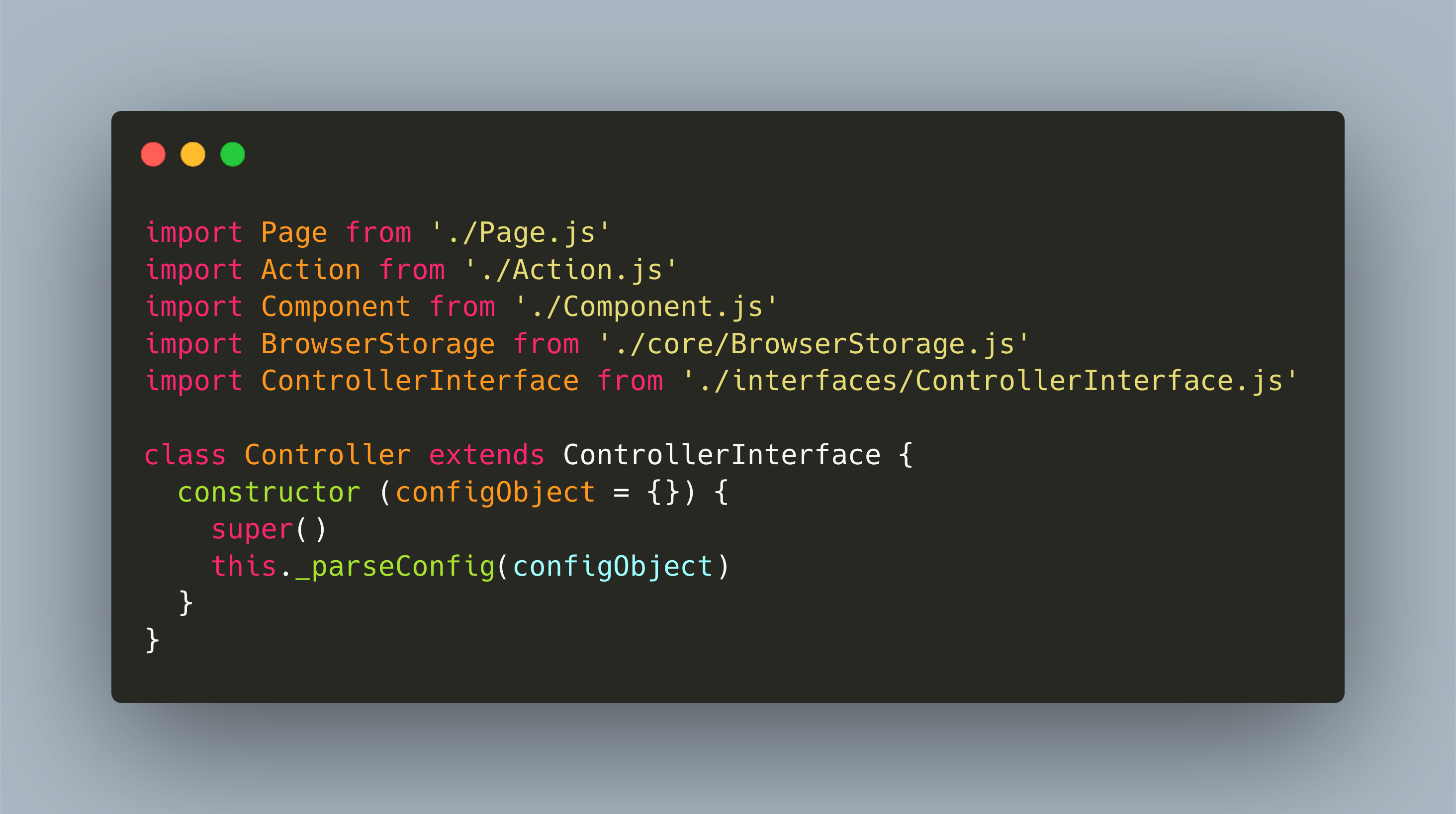 The controller is the central entity of the framework and the only JavaScript that will be loaded to the application. It provides the complete functionality to control which pages are rendered and loads the required JavaScript. Furthermore, it is responsible to keep the applications state and to communicate with any external API. Finally, it also serves as a gateway by importing and exposing shared JavaScript functions that are exposed by other entities.
