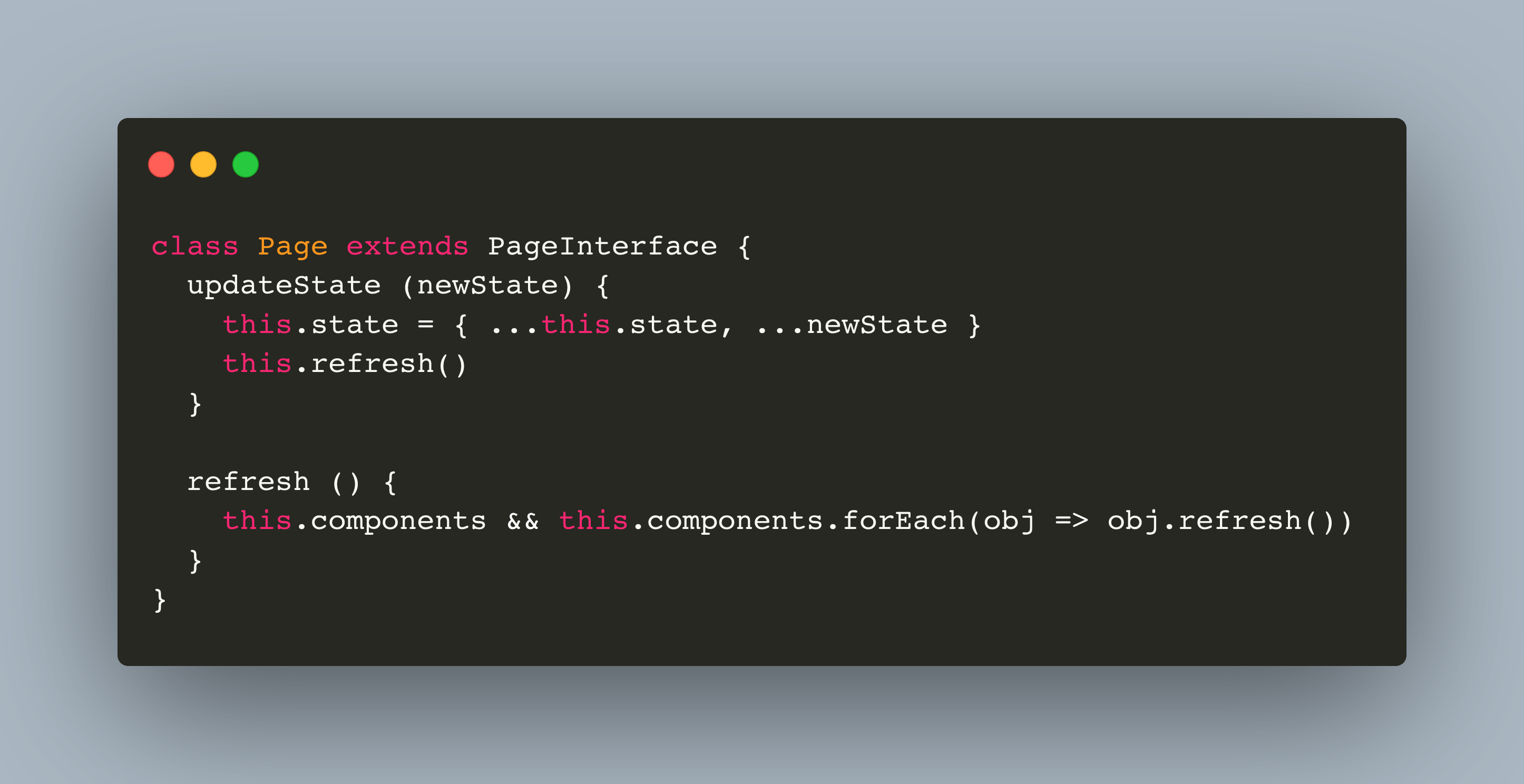 Every component of a page uses the very same methods: getState() and updateState(). These methods are implemented as follows: