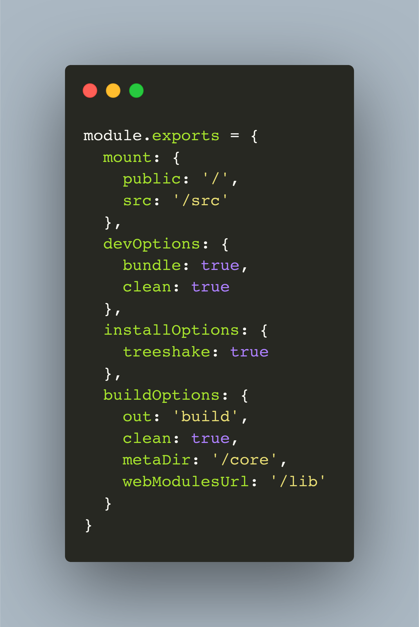 Snowpack is a bundler that comes with a robust default configuration. You can change several aspects with a snowpack.config.js file. In order to control the final layout, and details of the bundling process, I use the following config file.