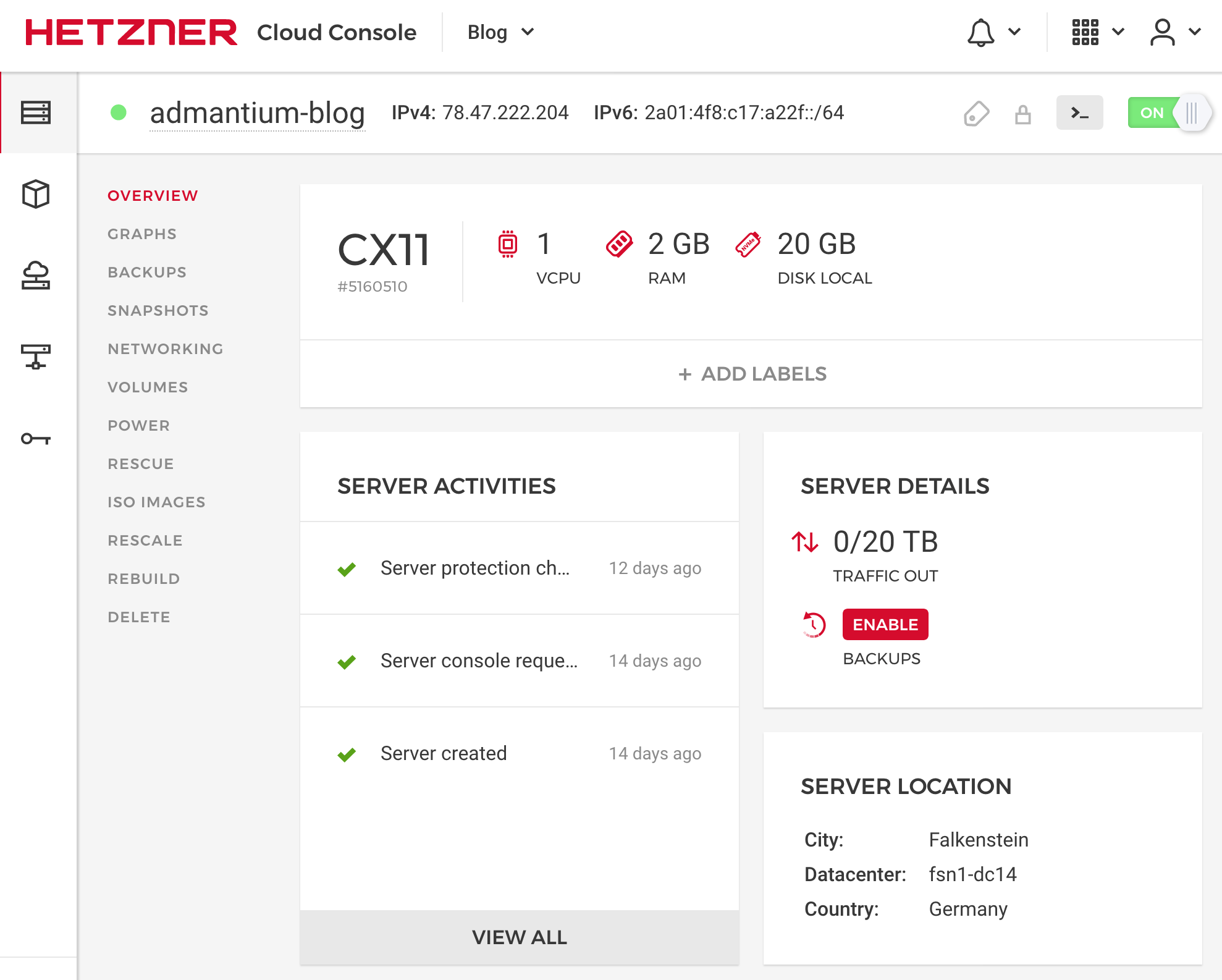 Hetzner is a German cloud computing provider. The reason I choose them is because they have good prices and a very usable Web UI. Furthermore, the have an HTTP API, as well as a CLI tool, Go and Python libraries.