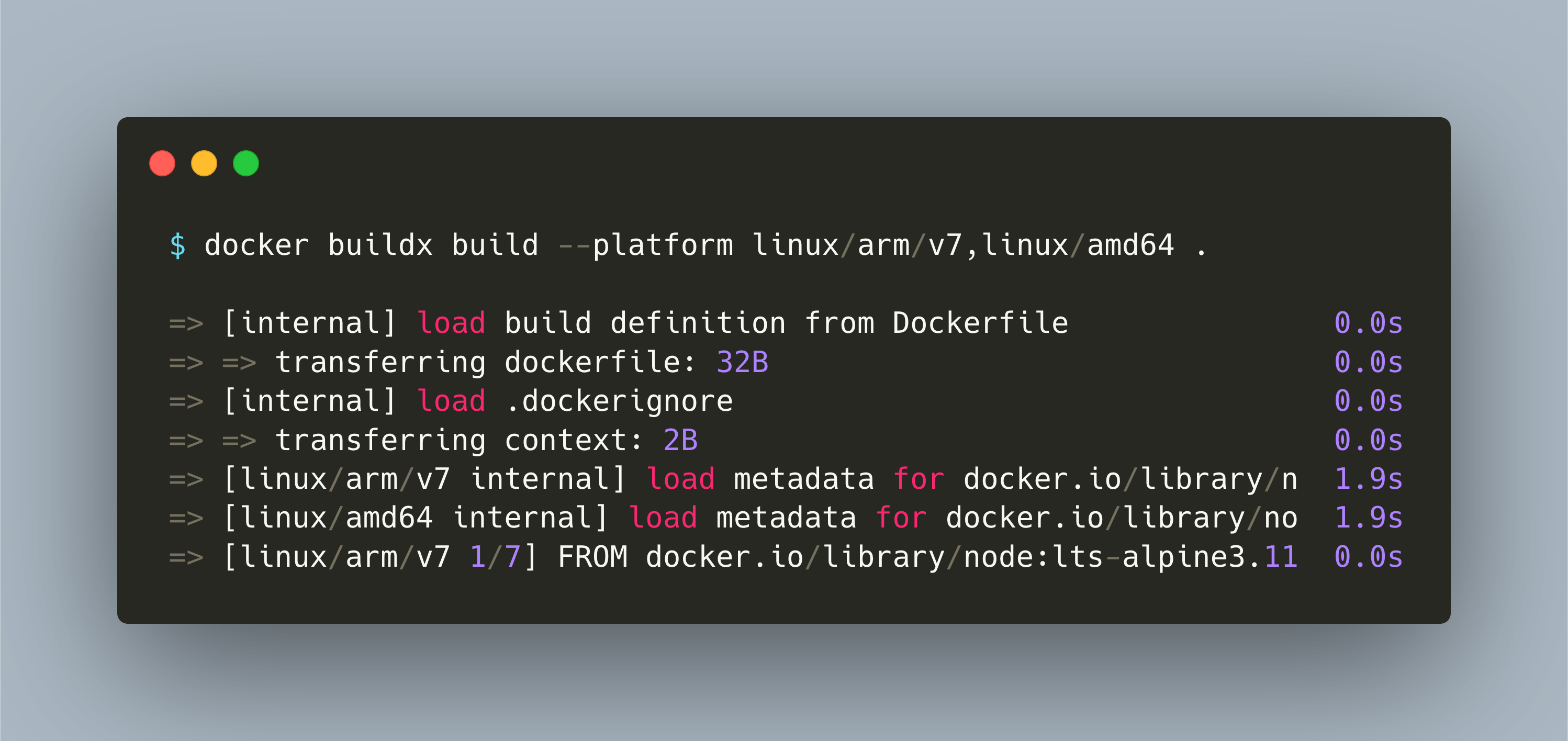 Now you can execute multiarch builds with the command docker buildx build. This command works just like docker build, but it has a new parameter called --plattform. Here you specify the target architectures for the build.