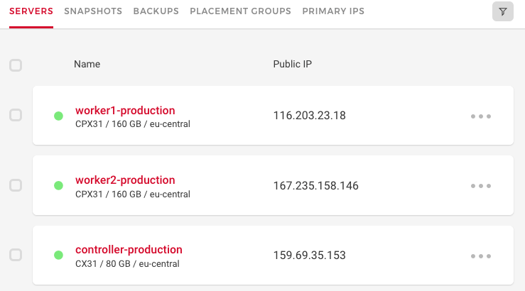 As you see, the nodes are named with the suffix -production, the Ubuntu image is used, and different server types are defined.