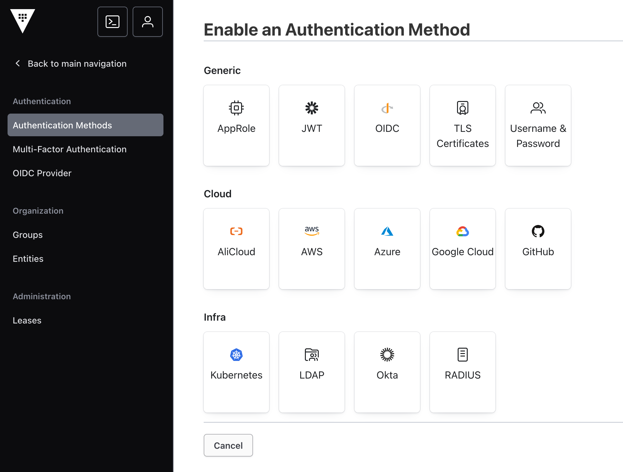 The default authentication mechanism is token, accepting the initial root token created during vault initialization, or any other token that was added manually. Several other authentication methods are supported as well, used by passing the flag -method to this command. Subcommands for different authentication mechanisms expose several flags for passing specific arguments such as in -method=userpass username=my-username.