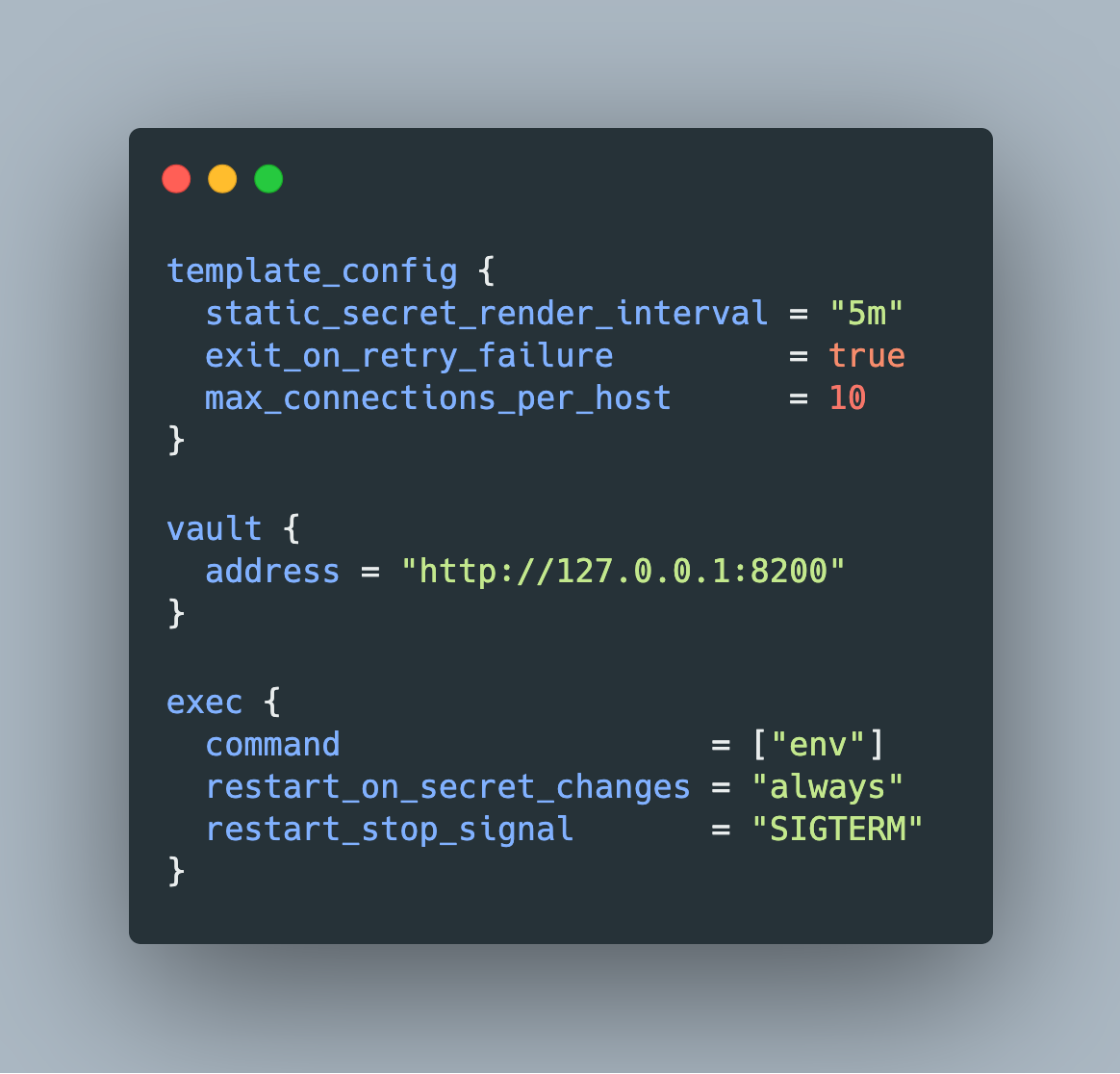 generate-config: As the name suggests, this command generates an agent configuration. Inhashicorp_vault_v1.20, the only option is to append-type="env-template". The resulting file is as follows: