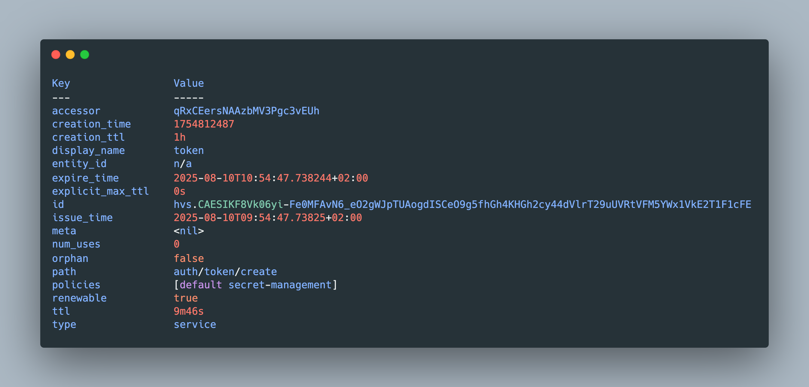 creation_time: Unix epoch timestamp encoding an absolute valuecreation_ttl: The initially defined Time-To-Live (TTL) after which the token expiresissue_time: Time string formatted creation time.path: The API path from which this token was created.